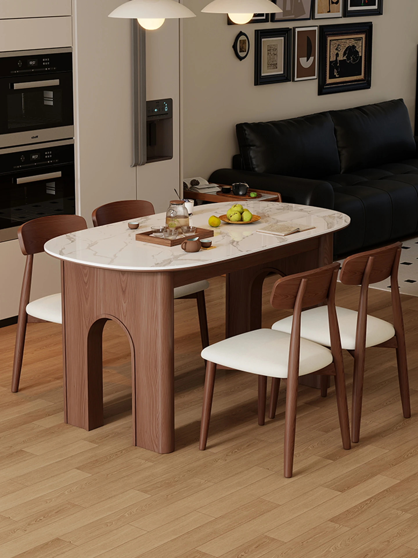 フレンチクリーム風のスリムな岩板ダイニングテーブル|小型住宅にぴったりなモダンミニマルデザインの楕円形テーブルと椅子のセットで、食事をもっと美味しく楽しく!
