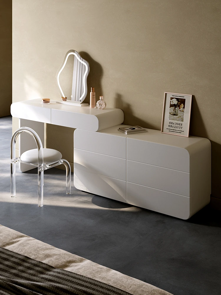 クリーム風メイクアップテーブル - 寝室収納キャビネット一体型、人気の侘寂スタイルの多機能高級コーナーメイクデスクで、洗練された空間を演出!おしゃれで実用的なアイテムで、あなたのビューティータイムを特別に!