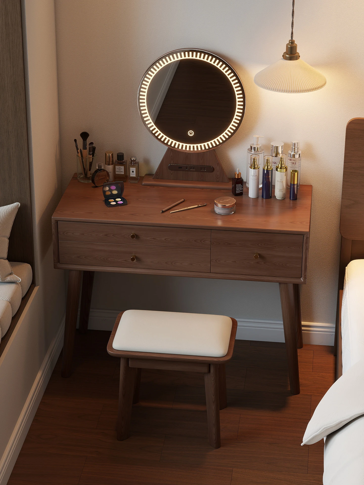 北欧スタイルの無垢材メイクアップデスク - シンプルでモダンな寝室にぴったり!トレンドのクリーム風デザイン、鏡付きで使い勝手抜群。おしゃれな空間を演出する、魅力的な化粧台です。