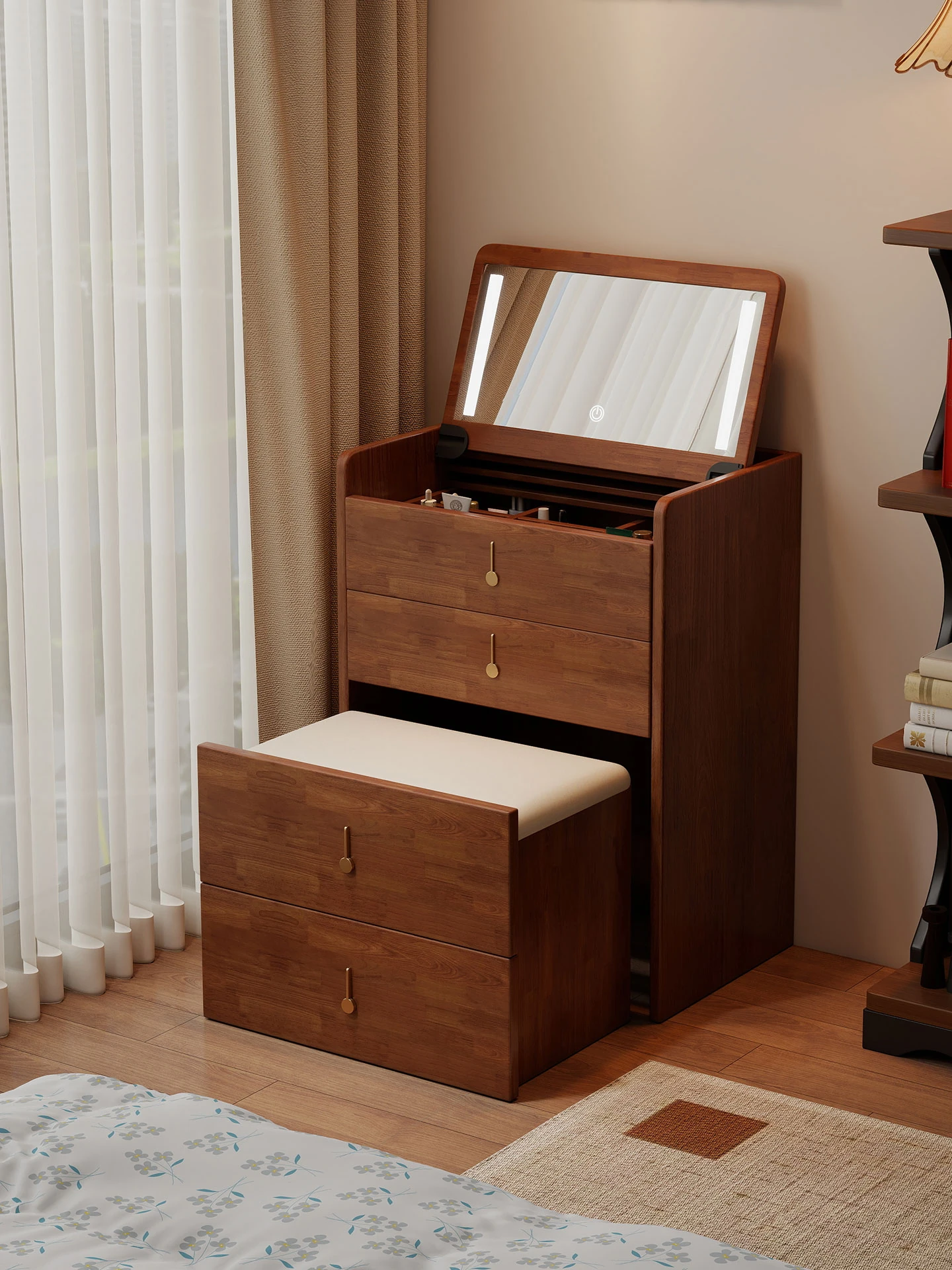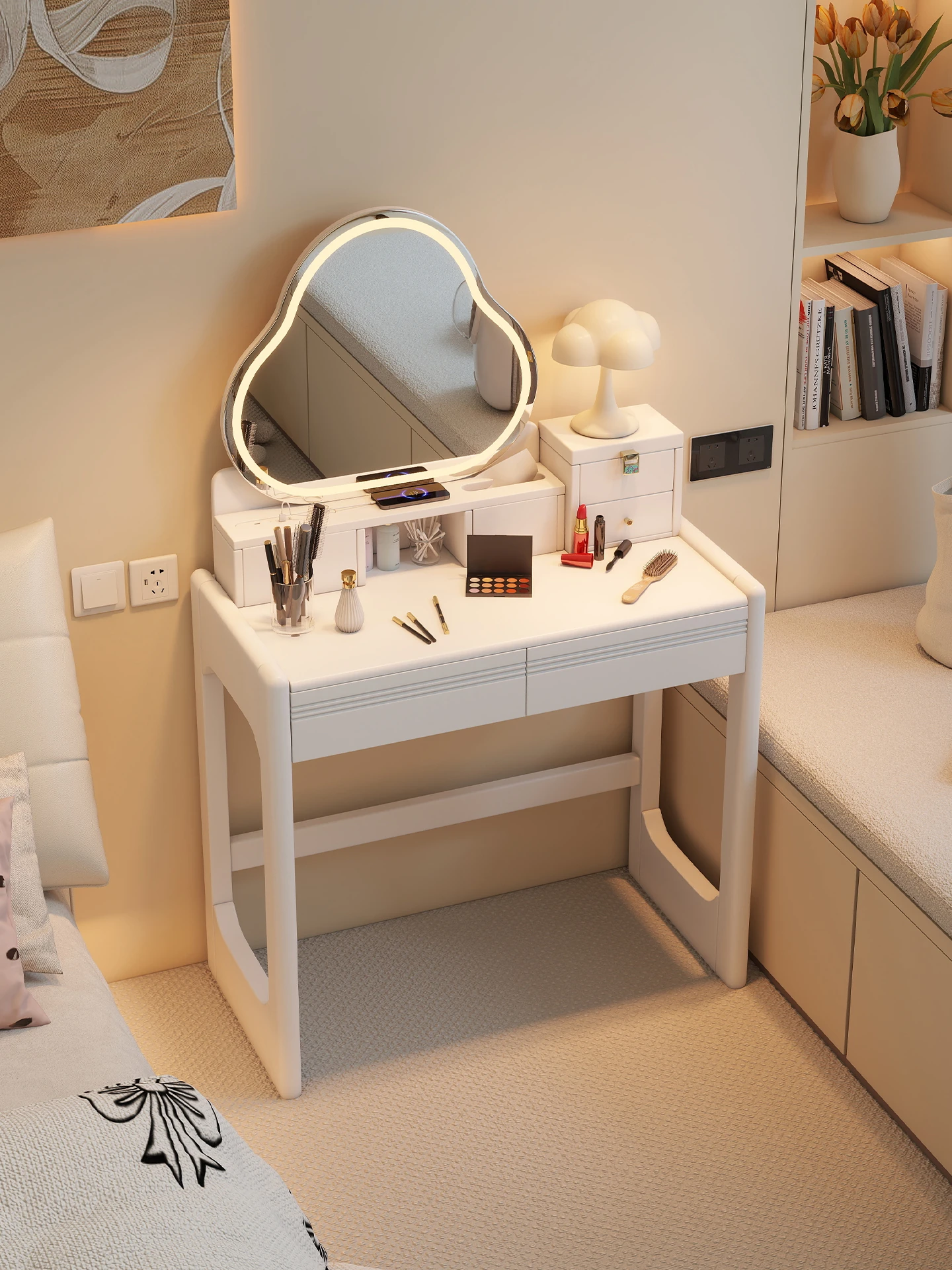 シンプルなクリームカラーの実木メイクアップテーブル - 小型寝室に最適な60cm高級ドレッサー兼チェスト一体型!おしゃれで機能的、あなたのメイクタイムを特別に演出します。