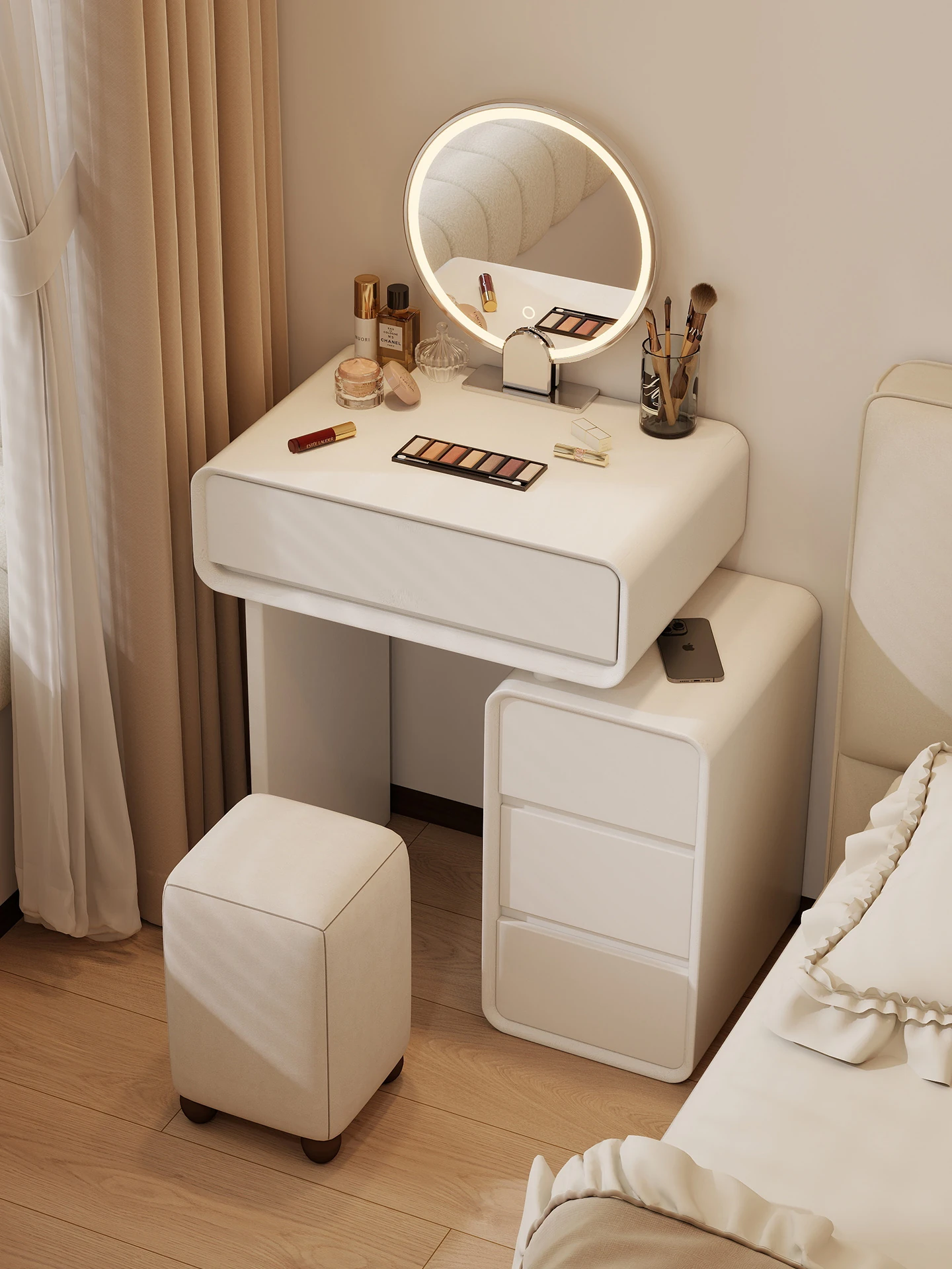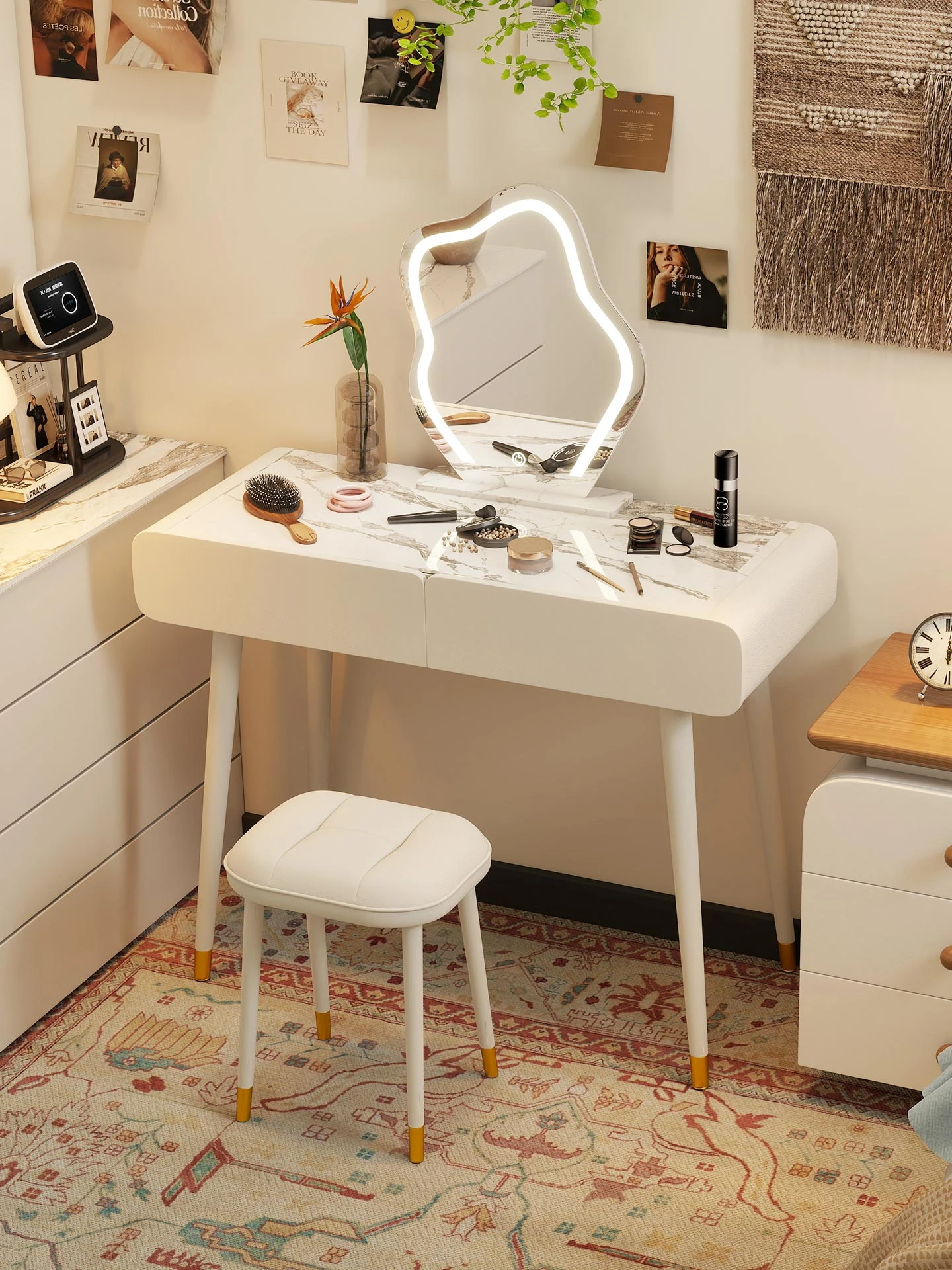 クリーム風のドレッサー、シンプルでコンパクトなデザイン。自宅用の化粧テーブル、ミラー付きで軽やかな高級感。岩板素材で収納機能も充実した一体型デスク。おしゃれな寝室にぴったり!
