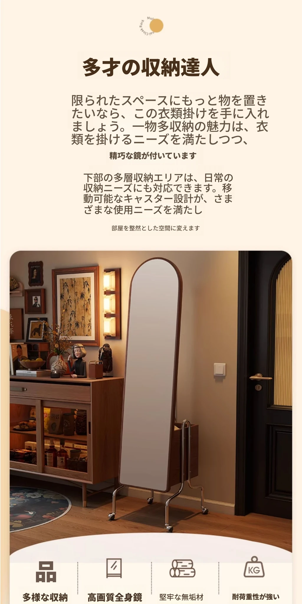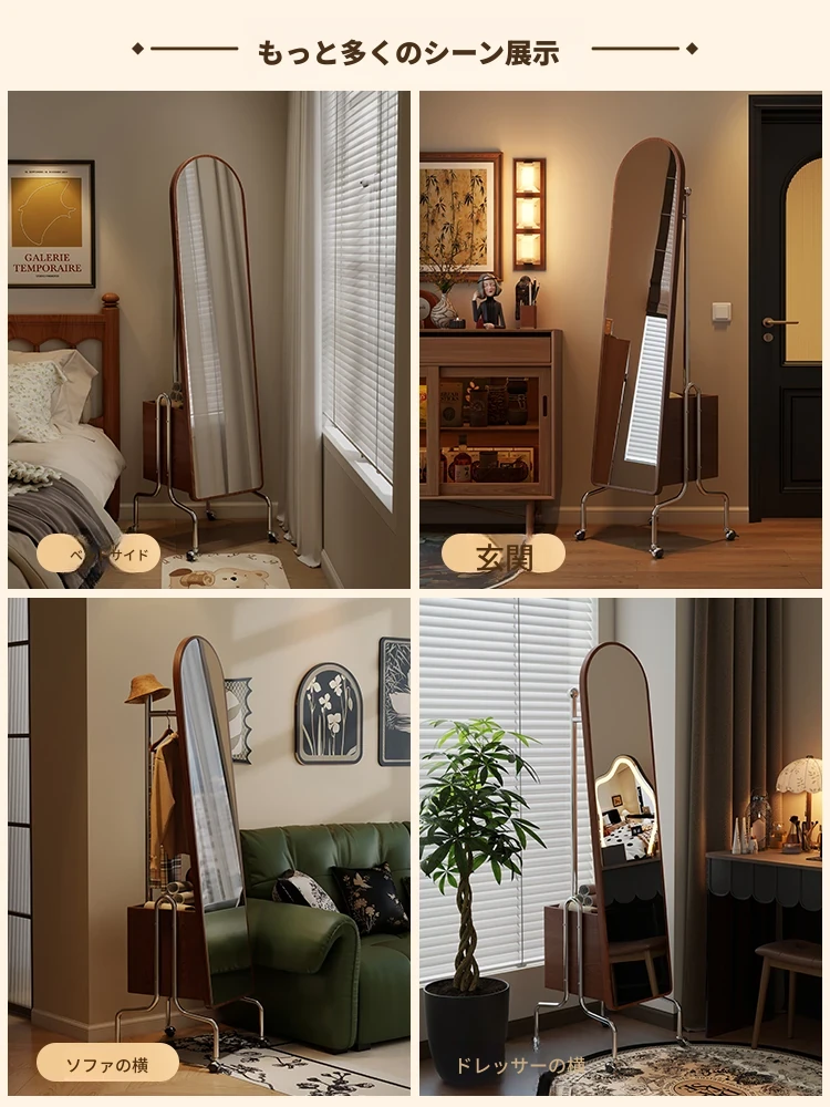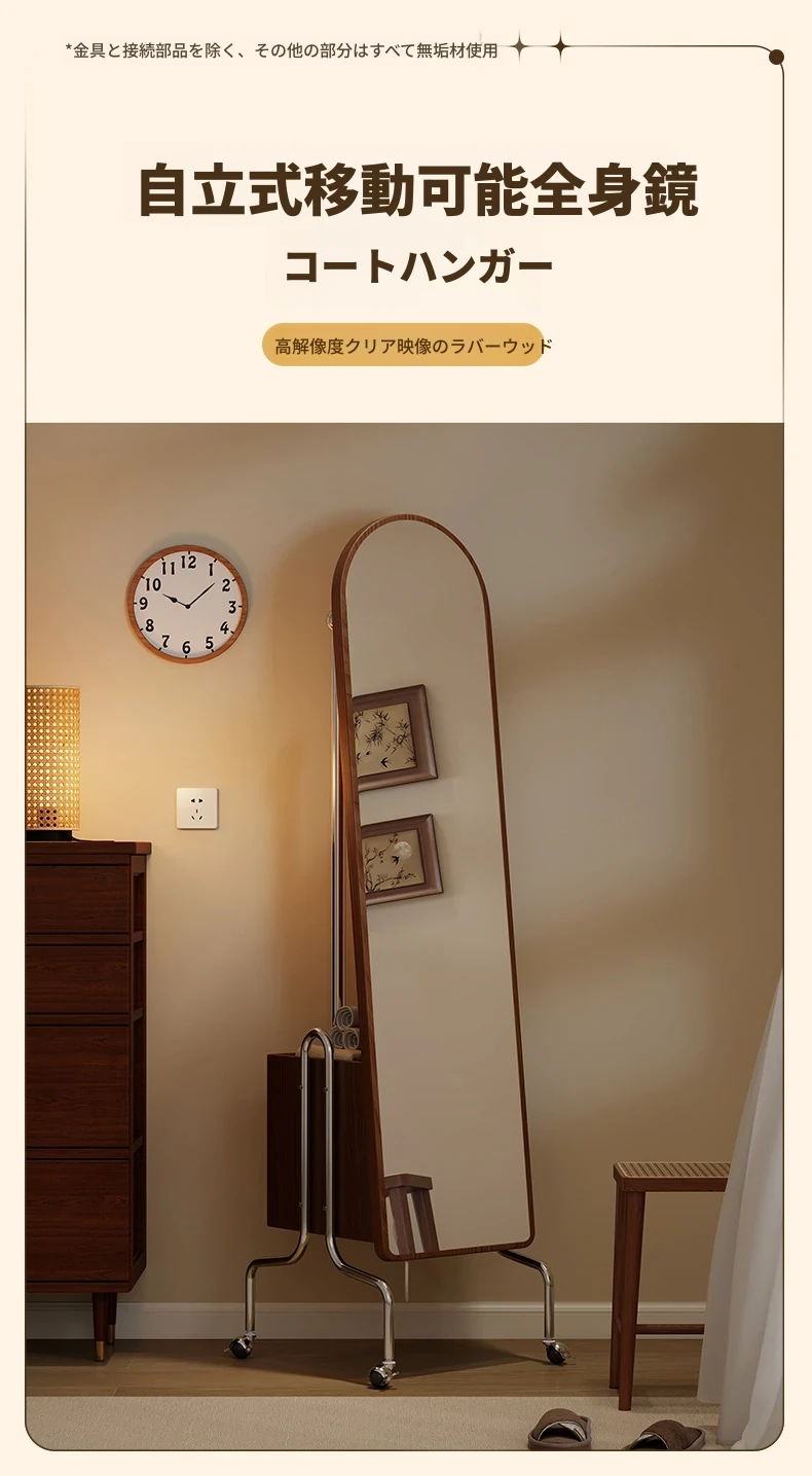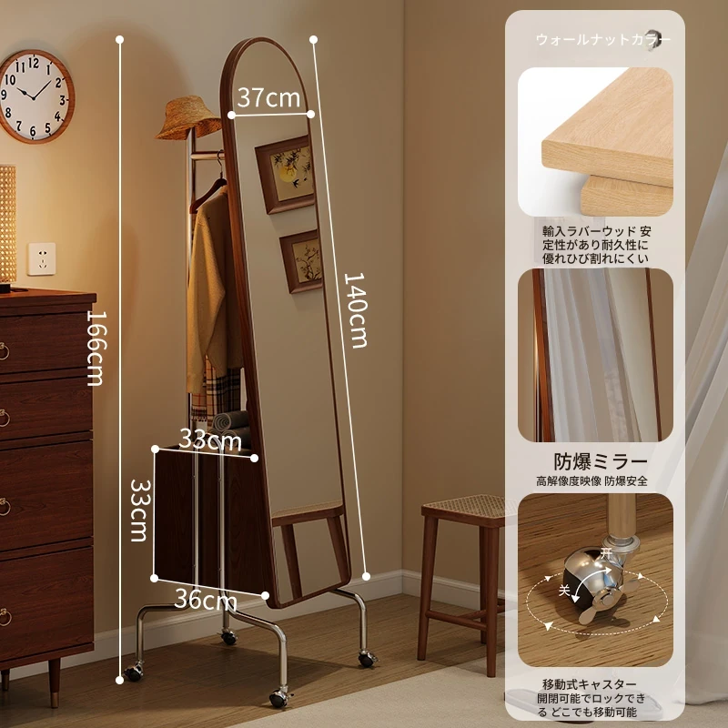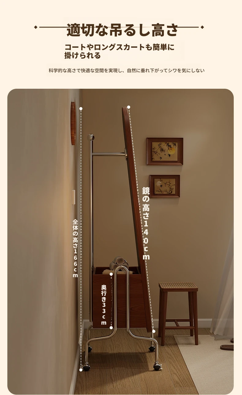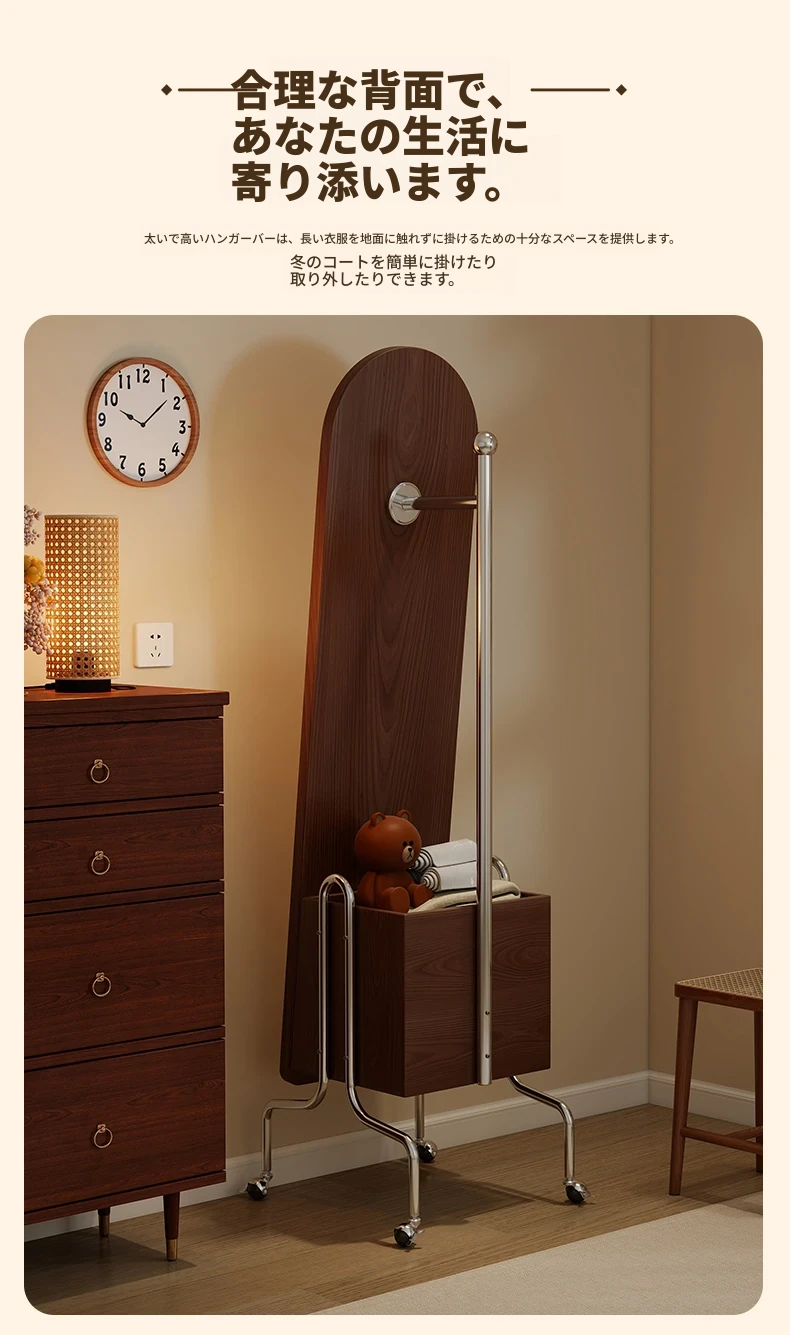 女性にぴったり!移動可能なドレッシングミラーとコートハンガーの一体型。寝室に最適な回転式全身鏡。おしゃれな家用アイテムで、服を掛けるスペースも確保!