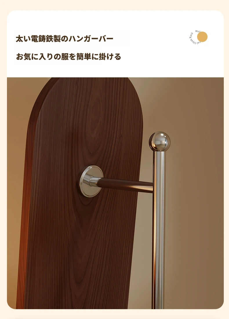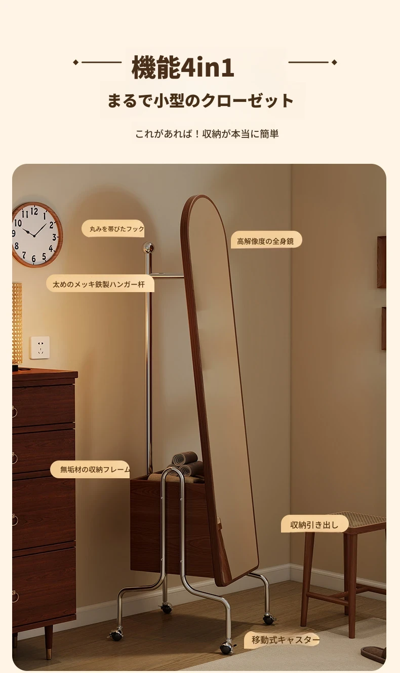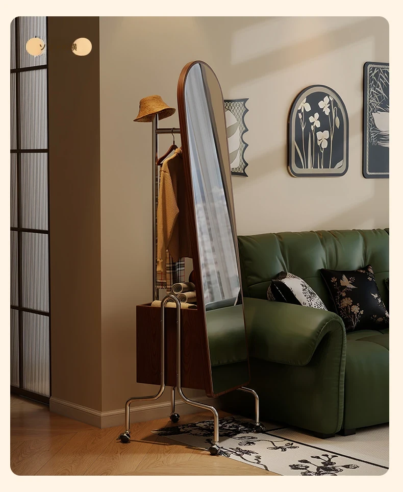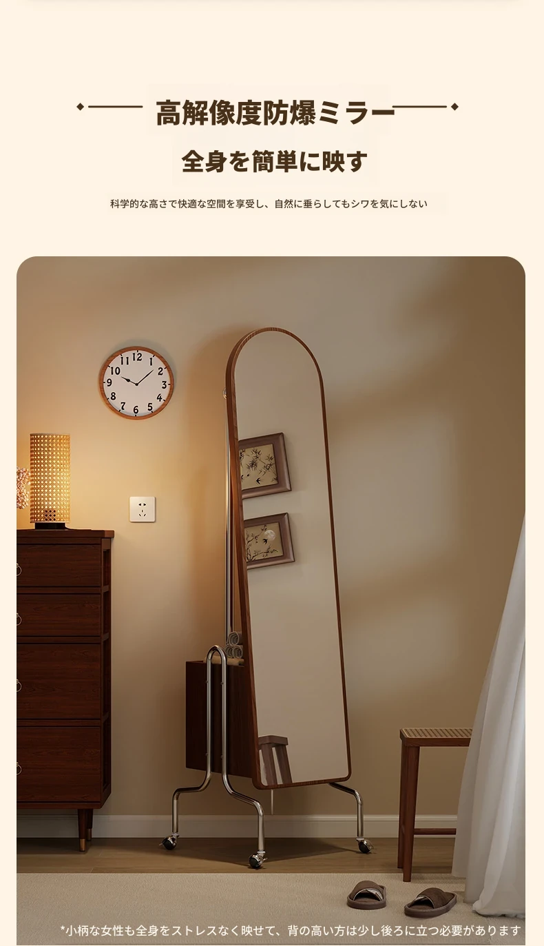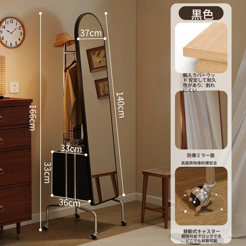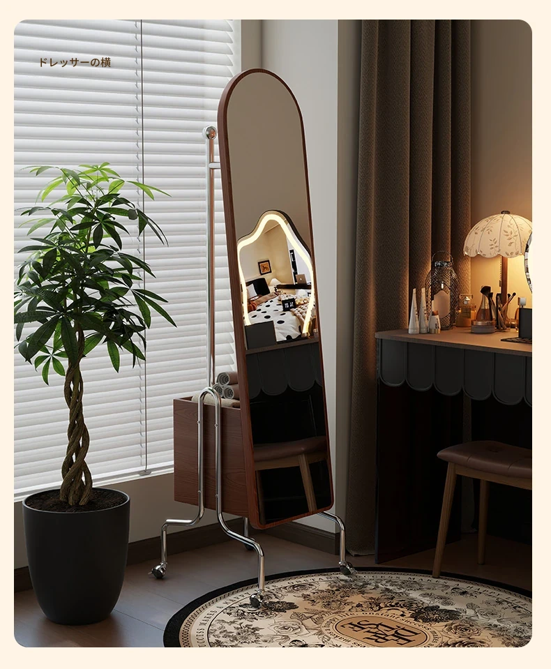 女性にぴったり!移動可能なドレッシングミラーとコートハンガーの一体型。寝室に最適な回転式全身鏡。おしゃれな家用アイテムで、服を掛けるスペースも確保!