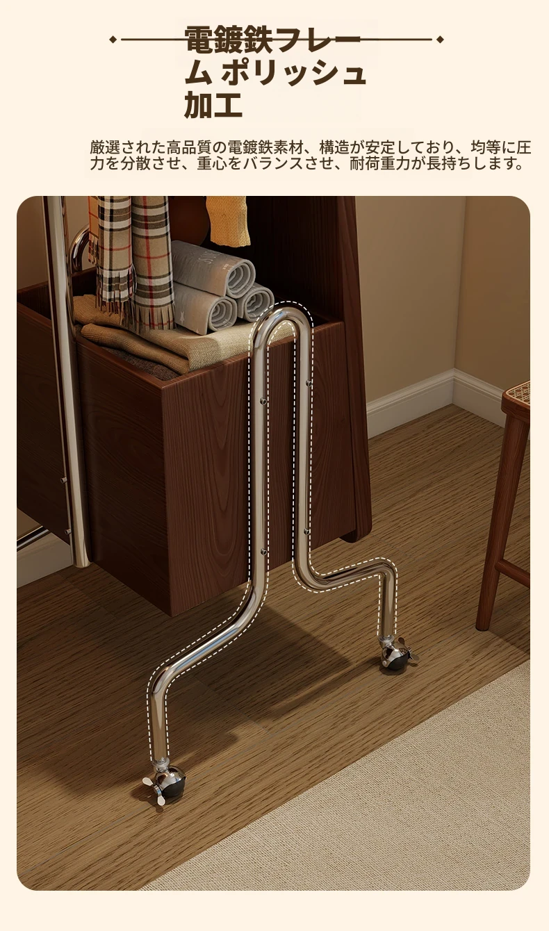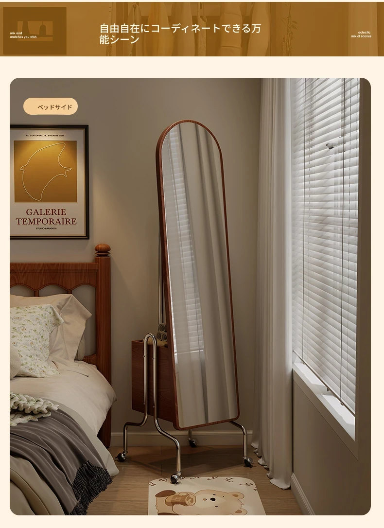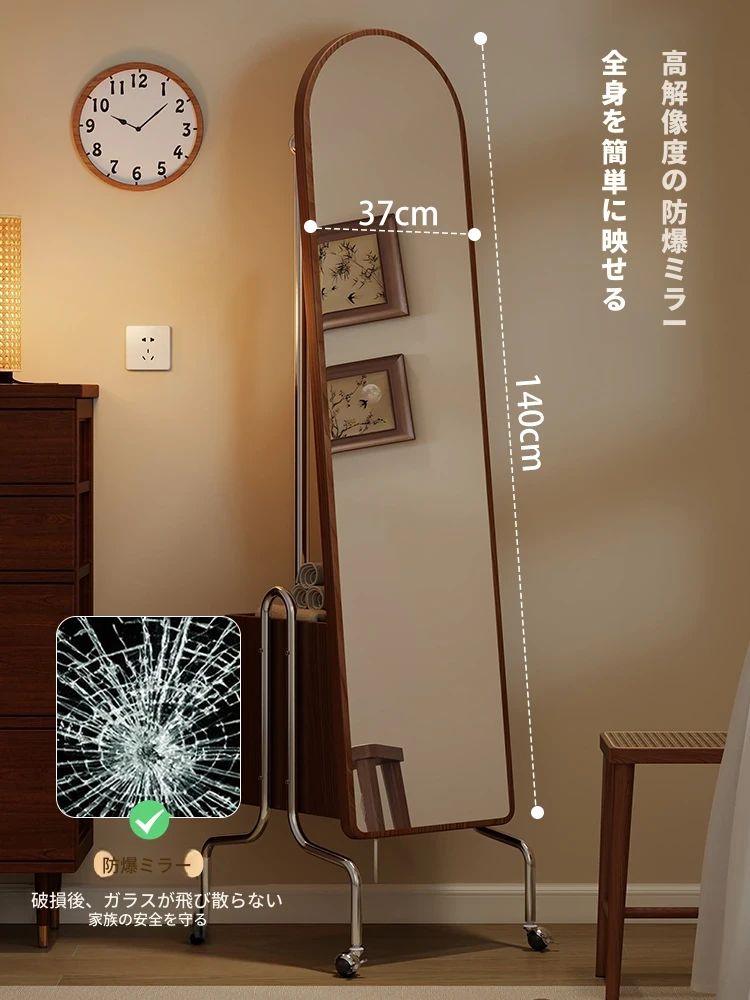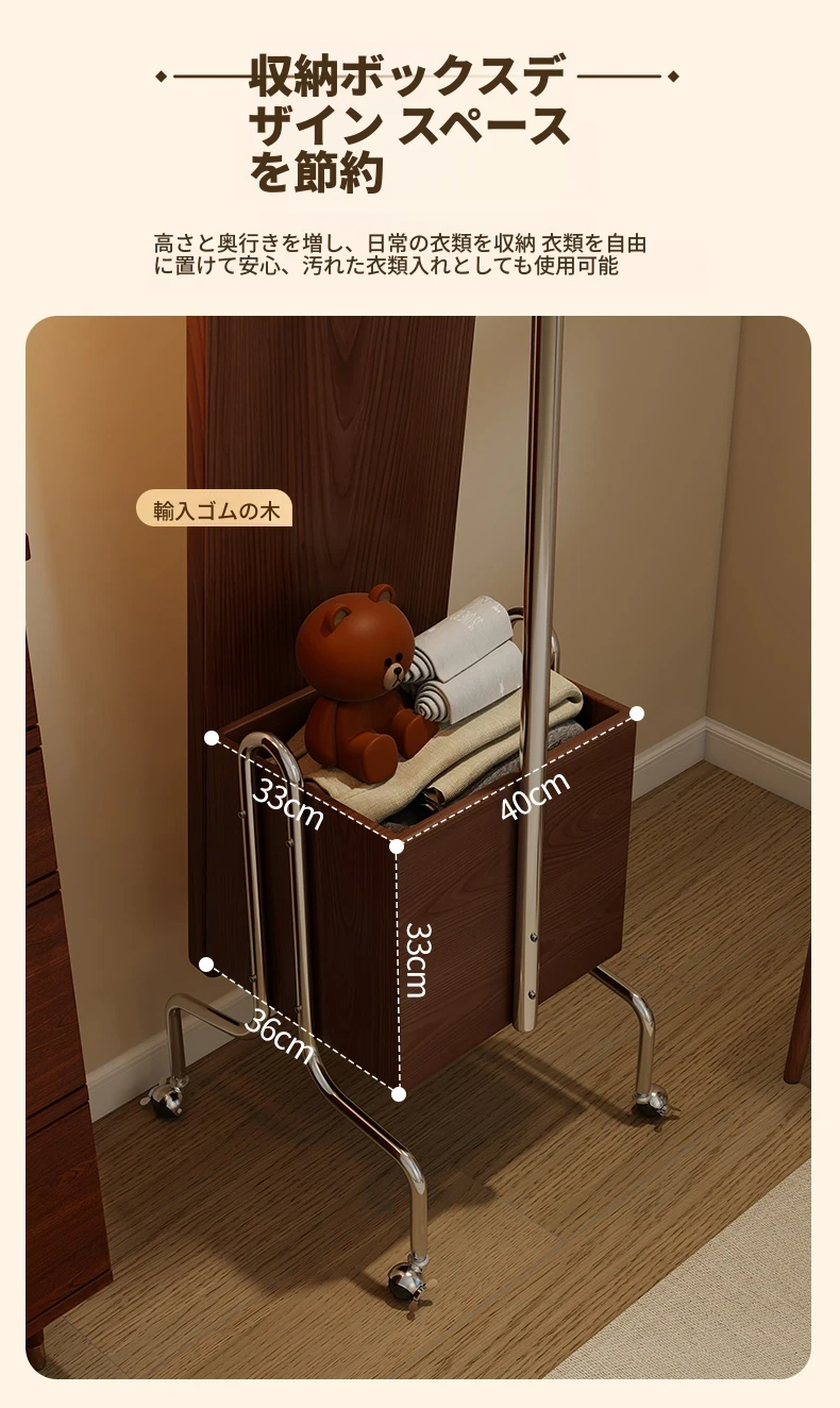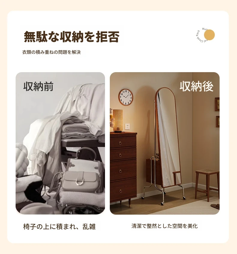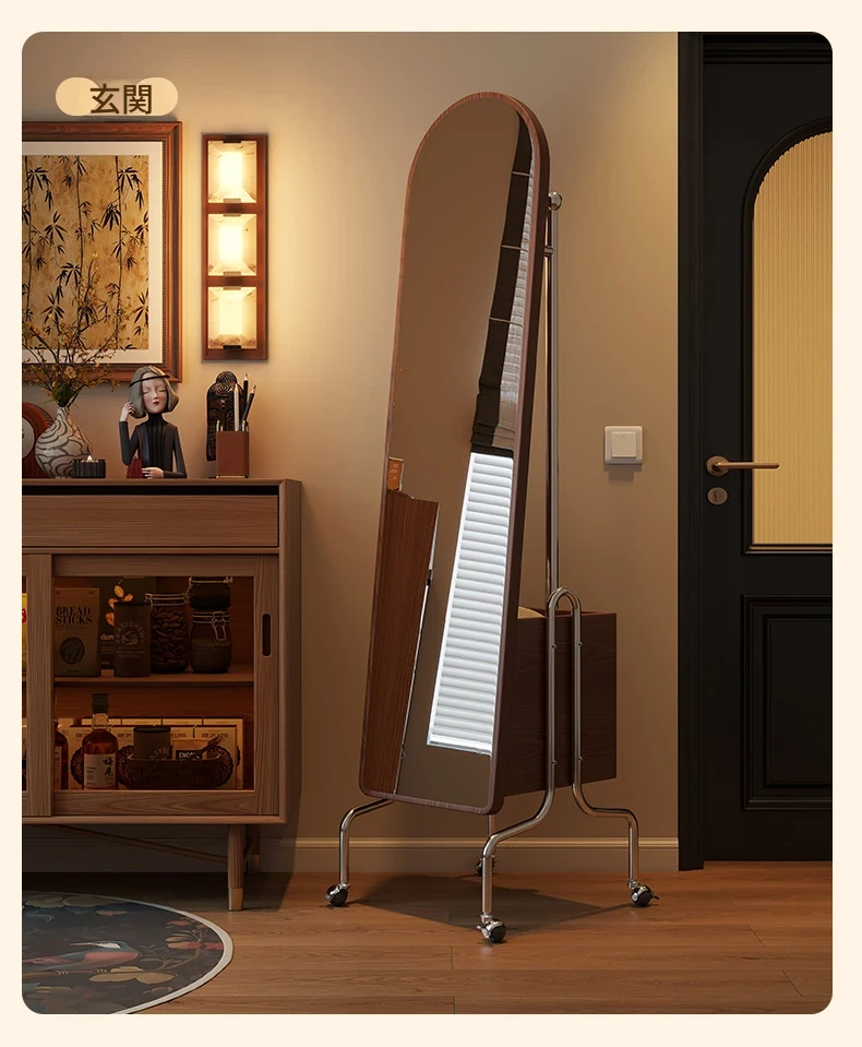 女性にぴったり!移動可能なドレッシングミラーとコートハンガーの一体型。寝室に最適な回転式全身鏡。おしゃれな家用アイテムで、服を掛けるスペースも確保!